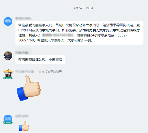 得知这一情况,公司领导第一时间成立救援小组,组织受火灾威胁的同事及家属迅速撤离,并为他们免费提供住宿场所,使他们得到妥善安置。