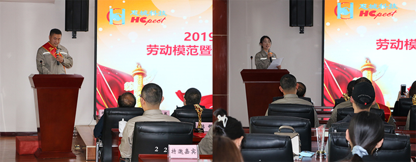 在热烈的掌声中,区总工会主席谭远玲和公司董事长张新功为劳动模范颁奖。