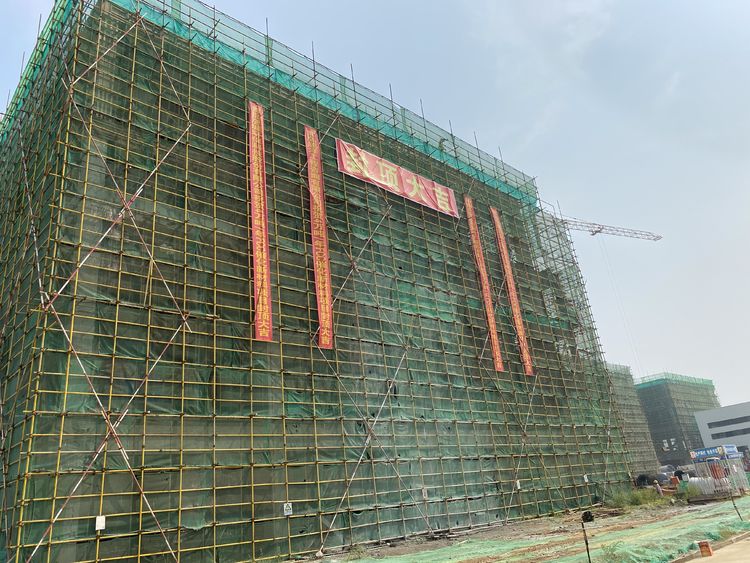 9时58分,封顶吉时,礼炮齐鸣。在场所有人都满怀激动的心情鼓起掌来,耸立的厂房被一条条红色祝福标语装点得格外喜庆。